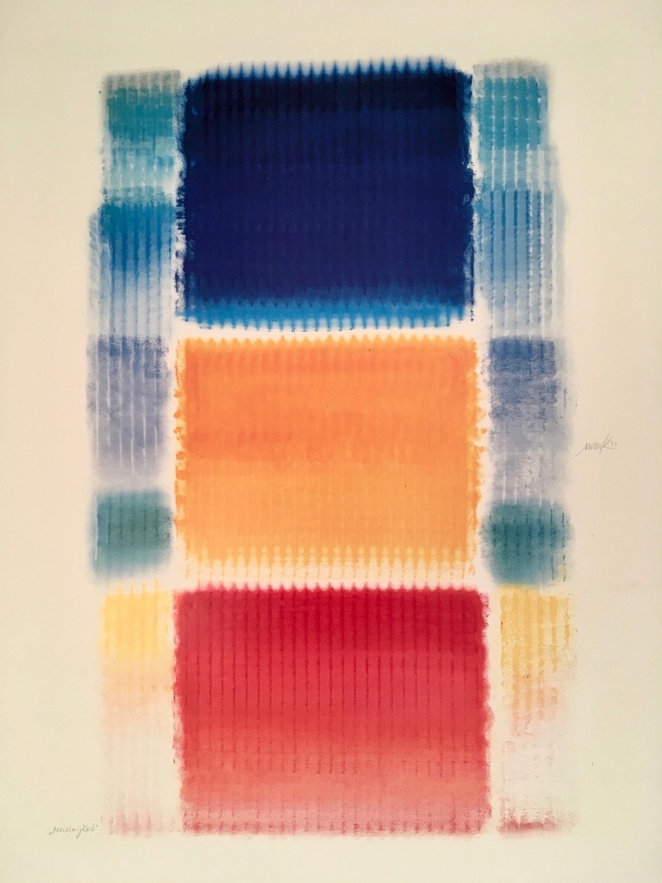 Heinz Mack „ Dreieinigkeit 1995“ nach einer Originalzeichnung von 1991. Druck mit 35 Sieben auf Bütten.Blatt: 100 x 70 cmAuflage: 70 arab. und 10 röm. nummeriert und signiert.Im Heinz Mack Werkverzeichnis der Druckgraphik und Multiples ist das Werk unter der Nummer 181 aufgenommen.