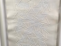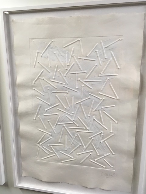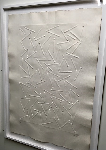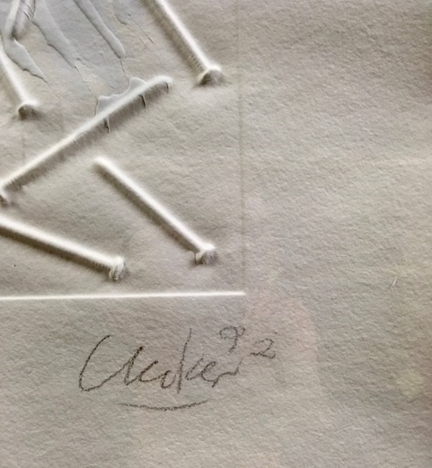 Ein Prägedruck auf handgeschöpftem Büttenpapier. Von Günter Uecker mit weisser Farbe bemalt. Unikat 1992 ca. 120 x 90 cm